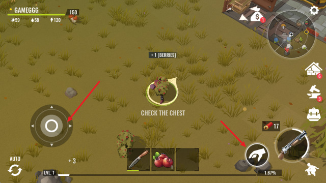 2、遇见猎物之后,拿起手中的武器,点击右侧的按钮即可射击,击杀后即可收集对应资源。
