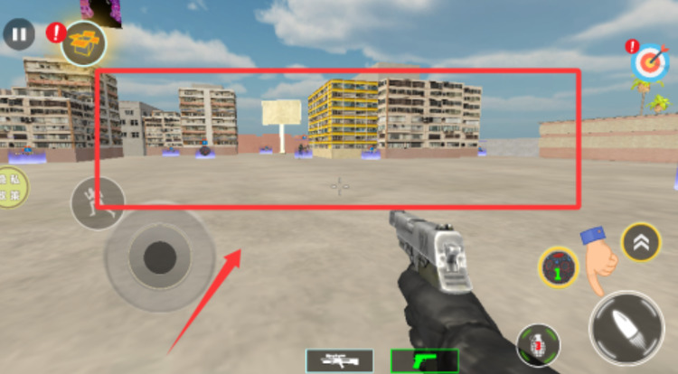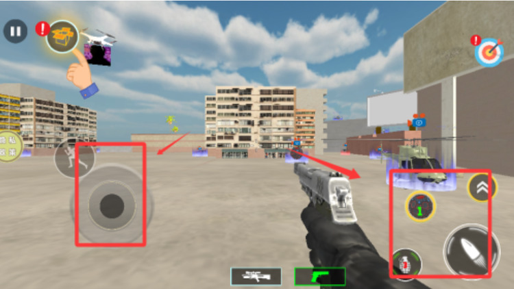 1、点击左下角的虚拟摇杆,控制角色移动,寻找敌人或掩体。