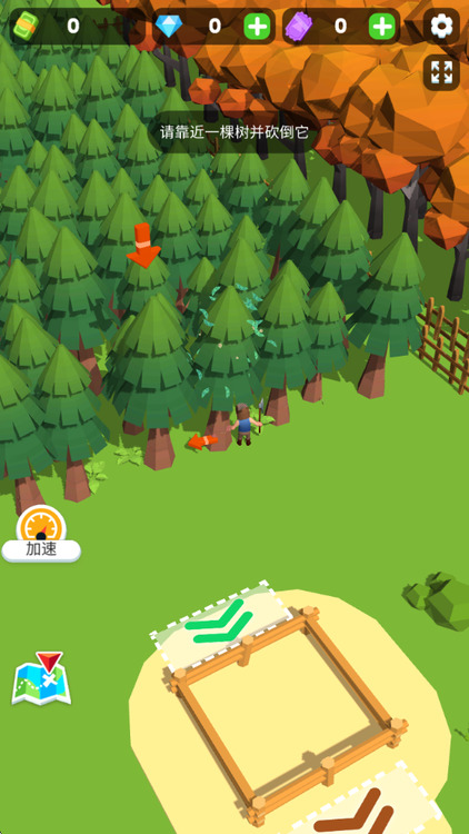 1、进入游戏后,拖动屏幕控制角色移动,来到森林中砍伐树木。