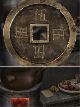 秋枯场景病人房间左侧柜子里符号,用铜钱显示是贰