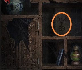 来到庭院进入厨房,在厨房柜子里和火炉旁边的凳子上分别有两个符号。