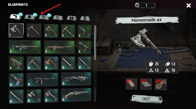 2、进入后,点击上方栏目即可制作各种不同类型的武器。