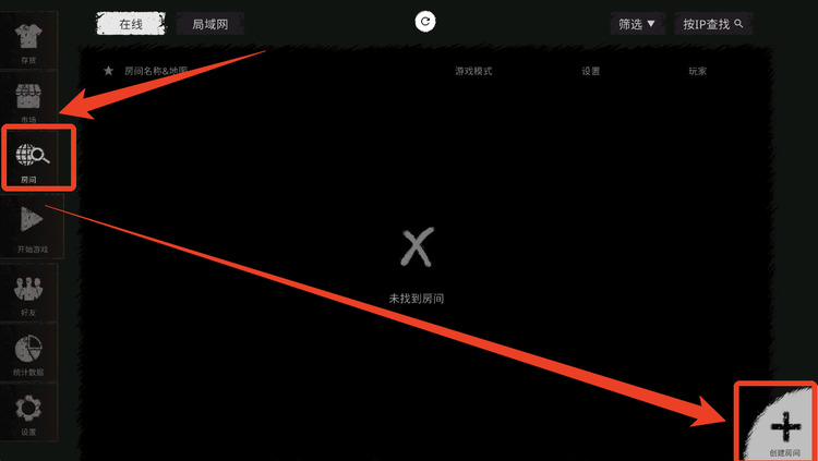 1、进入游戏后点击左边的【房间】,再点击右下角的【创建房间】。
