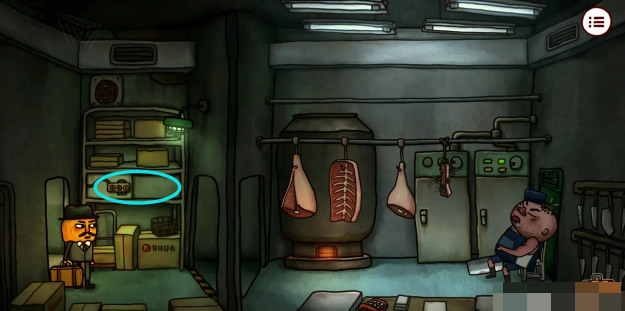 4、回到初始房间走右边楼梯来到屠宰场门口,拿走左下角的「油漆刷」后进入屠宰场。点击架子上的机关,根据之前拿明信片的箱子上的提示完成机关,打开右边的柜子后拿到里面的「绝缘手套」,接着点击20次猪肉达成成就【太想吃肉了】。