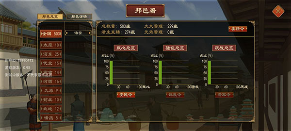 邦邑署:查看全国各地都邑大夫和城邑信息的地方,可以进行一键任用大夫,根据判心,骚乱,厌战的柱状图了解全国各地的详情进行一键操作,也可以在详情里面单独对一座城邑进行任命。详情列表带有加号的,都可以进行高低排序查找,方便我们根据情况来任免大夫。判心高的我们可以用纵横家降低骚乱,骚乱用儒家,厌战用阴阳家等等,下面是小夏亲自测试出来的所有流派作用。