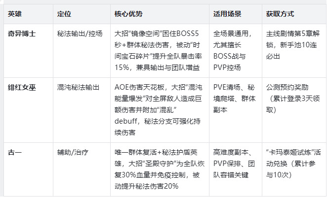 奇异女孩:辅助型法师,提升全队回蓝速度,适合秘法技能消耗高的阵容,但治疗能力较弱,需搭配古一使用。