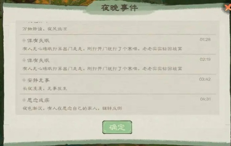 夜晚时间在桃源记2中也随季节变化而调整。夏季天黑较晚,约19:00才进入夜间,其他季节则天黑较早。夜晚村民停止劳作,但玩家可借此机会举办家宴,提升村民饱食度、寿命及体质经验。若有访客在村中,家宴还能增加其好感度,未来可能带来稀有礼物。追求效率的玩家也可选择跳过夜晚,直接进入下一个工作日。