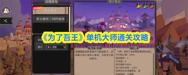 《为了吾王》单机大师通关攻略。《为了吾王》是一款冒险策略类手机游戏。如果想要在单机模式下取得大师级(三皇冠)通关成绩,就必须合理规划角色选择、陷阱设置和道具使用。以下是《为了吾王》单机模式的大师级通关攻略,供大家参考。