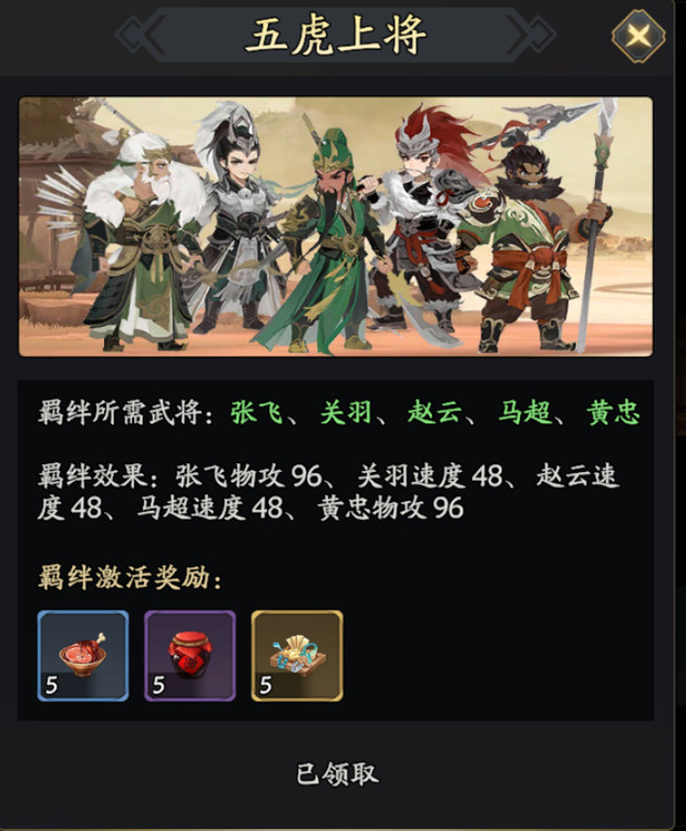 主公同时拥有关羽、张飞、赵云、马超、黄忠,就可以解锁家喻户晓的【五虎上将】羁绊!