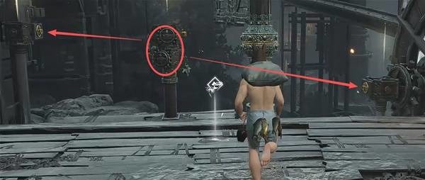 1、先在初始位置触发发光地板机关,用太极将石块投到右侧木板机关。