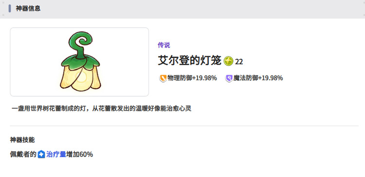 艾尔登的灯笼很适合用于前排角色身上,拥有不错的物理防御效果,魔法防御也有一定加成,还有一定的治疗能力,让小伙伴们可以回一定的血量。