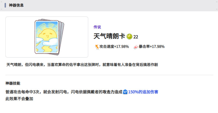 天气晴朗卡也是可以带来攻速和暴击方面的加成,如果大家攻击中三次的话,那么还可以得到一个闪电发射效果,拥有最佳攻击能力。