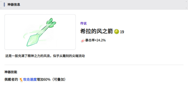 希拉的风之箭可以搭配给风属性的角色,效果会更好,装备起来的加成效果是十分不错的,有60%的攻速增加,叠加起来用于暴击流非常适合,如果大家喜欢玩风属性的角色,不妨试试这个武器。