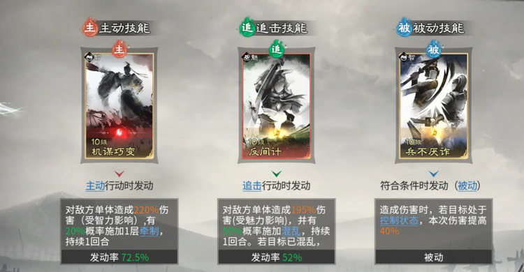 诸葛亮承担整套体系的控制中枢职能。其天赋【料敌机先】在战斗开始时即提供3层初始层数,我方每次释放技能均可叠加,敌方每使用一次技能则消耗1层。该效果不仅造成72%伤害,更触发智力比拼判定,胜出后可使目标陷入【技穷】状态,持续1回合无法释放主动技能。技能搭配方面,主动技能推荐【机谋巧变】,兼顾高额伤害与概率性牵制效果,有效抑制敌方追击发动;追击技能选用【反间计】,除稳定输出外,还具备混乱敌方单位的概率,使其攻击目标完全随机;被动技能固定选择【兵不厌诈】,对处于控制状态的敌人提升40%伤害,完美契合本队控伤一体化设计。