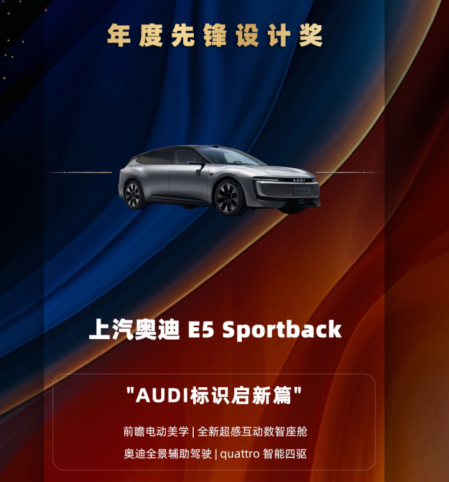 在1180网2025年度卓越产品评选中,上汽奥迪E5 Sportback凭借在电动化背景下的设计创新和品牌表达能力,荣获“年度先锋设计奖”。